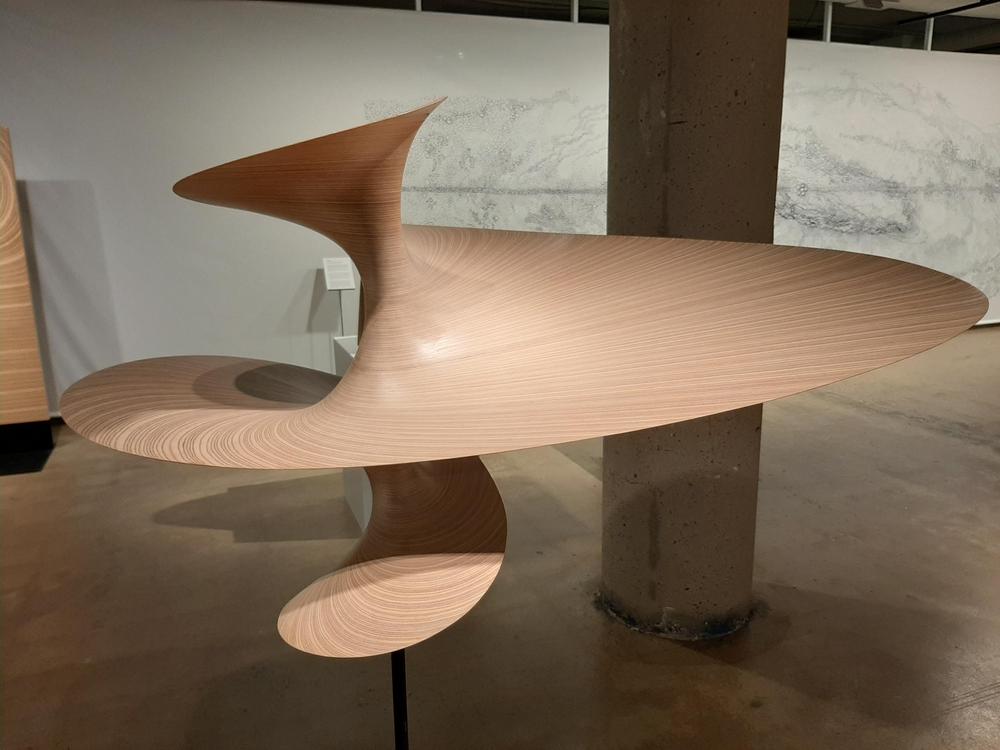 Taiteilija Elina Juopperi esitteli "Perintö"-teoksen taustaa ja rakentumista. Raanuista koostuva teos on valmistuttuaan kuutio, jonka särmän pituus on 180 cm (6 jalkaa).
