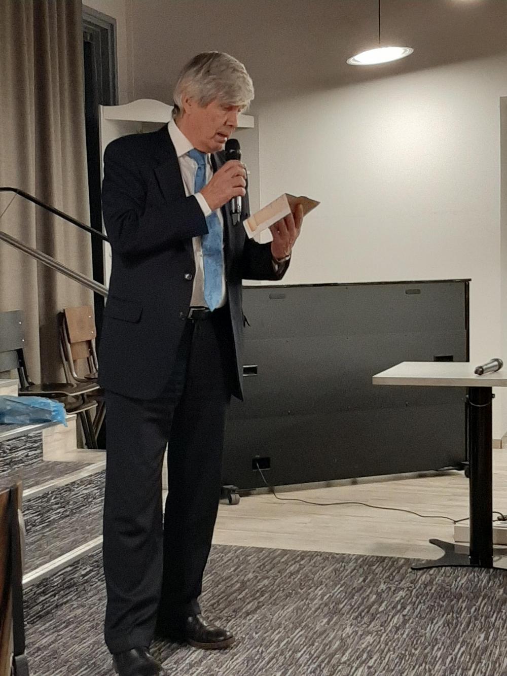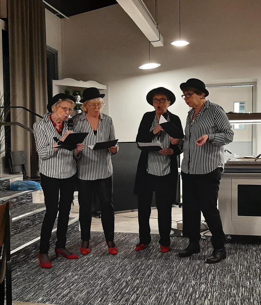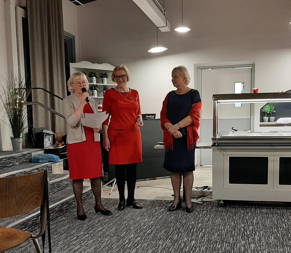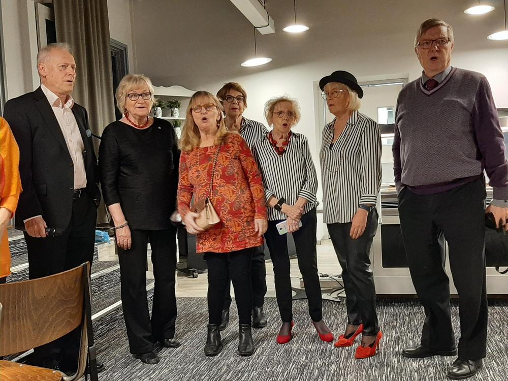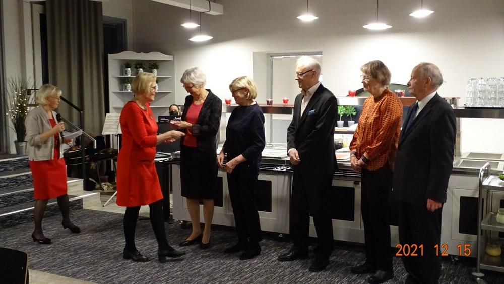 Juhlan alkajaisiksi Matti Lehtonen tarjosi jouluglögit, sillä hänellä oli äskettäin syntymäpäivä. Räppileidit räppäsivät Matille. Kuvassa mukana myös vaimo Elsa Luukkonen, joka esitti meille runon lausuntaa. (EK)