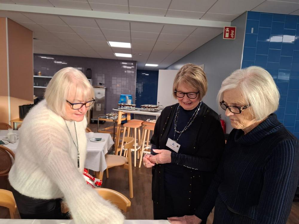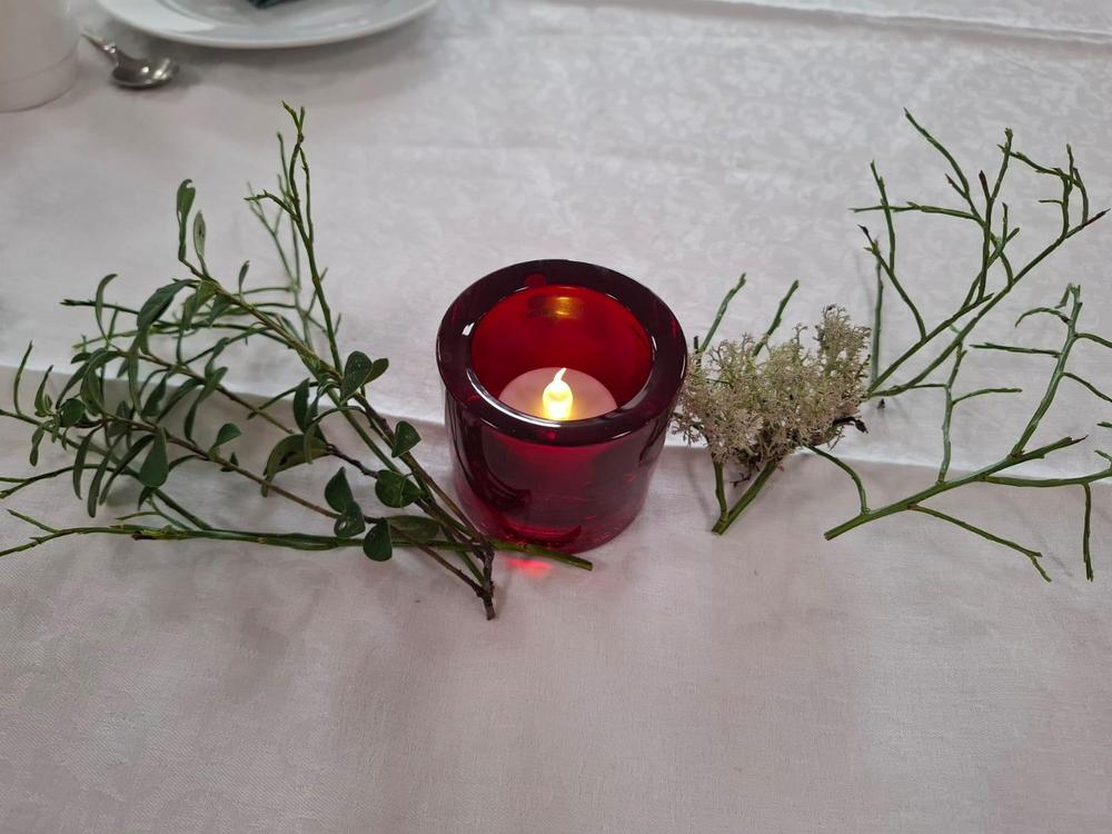 Tiedottaja Eila ja emäntä Riitta, Marja, Anneli, Eija ja Marja-Liisa ja iso joukko muita yhdistyksen jäseniä olivat koristelleet pöydät kauniisti vihreillä varvuilla ja värikkäin kynttilälyhdyin. Yhdistyksen edustajat ottivat kunniavieraat arvokkaasti vastaan ovella.