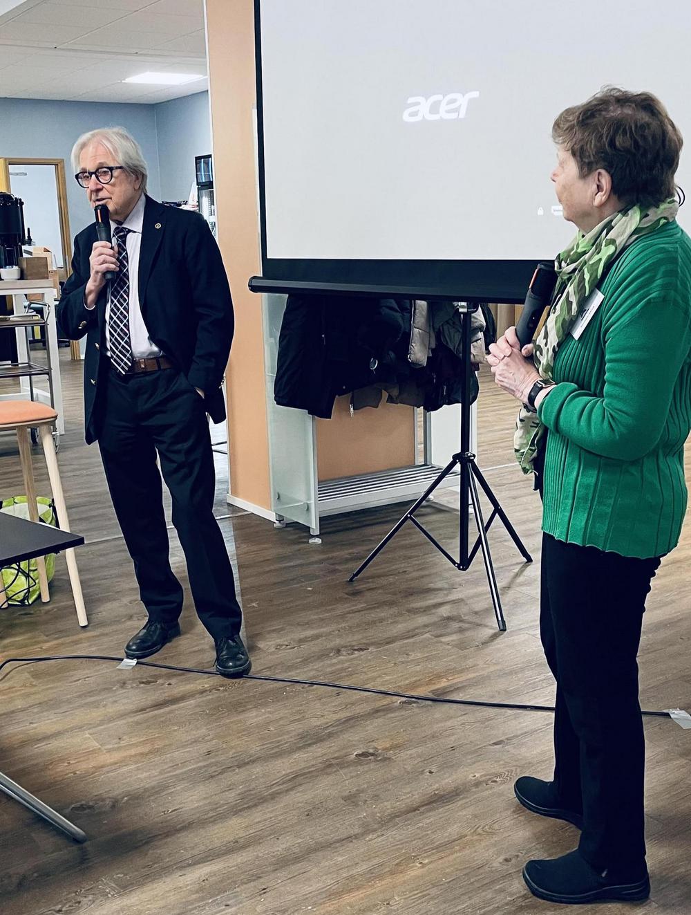 Vuoden 2026 kolmannessa jäsentilaisuudessa saimme kuulla Markku Veijalaisen kertomana Markku Veijalaisen noususta kuuluisaksi esiintyjäksi. Hannele Hankala-Rämä haastatteli Markkua em. aiheesta ja lopuksi Markku esitti kolme musiikkikappaletta, jotka ovat olleet maamerkkejä hänen urallaan. Kuvassa Hannele ja Markku.